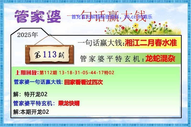 116期:管家婆一句话赢大钱:【独怜三二涧边有】 解释:独怜三二涧边有,解大数特码25-49,解双肖虎鼠狗猴马龙 特肖:蛇狗马羊鸡猴 ![]() |